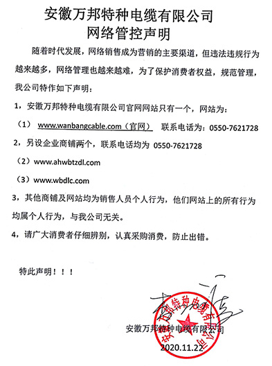 鄭重聲明:安徽萬邦特種電纜有限公司官方網站為:www_wanbangcable_com.32ppt.com,除此之外無任何子網站或合作網站,其余均為假冒偽劣。電話:0550-7621728 13485756353 地 址:安徽省天長市滁州高新技術產業開發區經四路29號